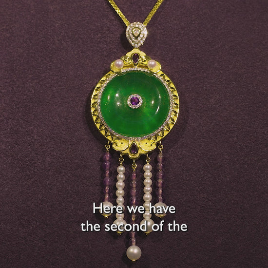 Elegance meets vibrancy in this breathtaking pendant, featuring a captivating Imperial Jadeite round disc stone at its centre, framed by warm 18ct yellow gold. Surrounding the stone are pear-shaped amethysts, brilliant-cut diamonds, and lustrous pearls. The pendant is beautifully complemented by delicate strands of amethysts and pearls, adding movement and depth to this exquisite design.
