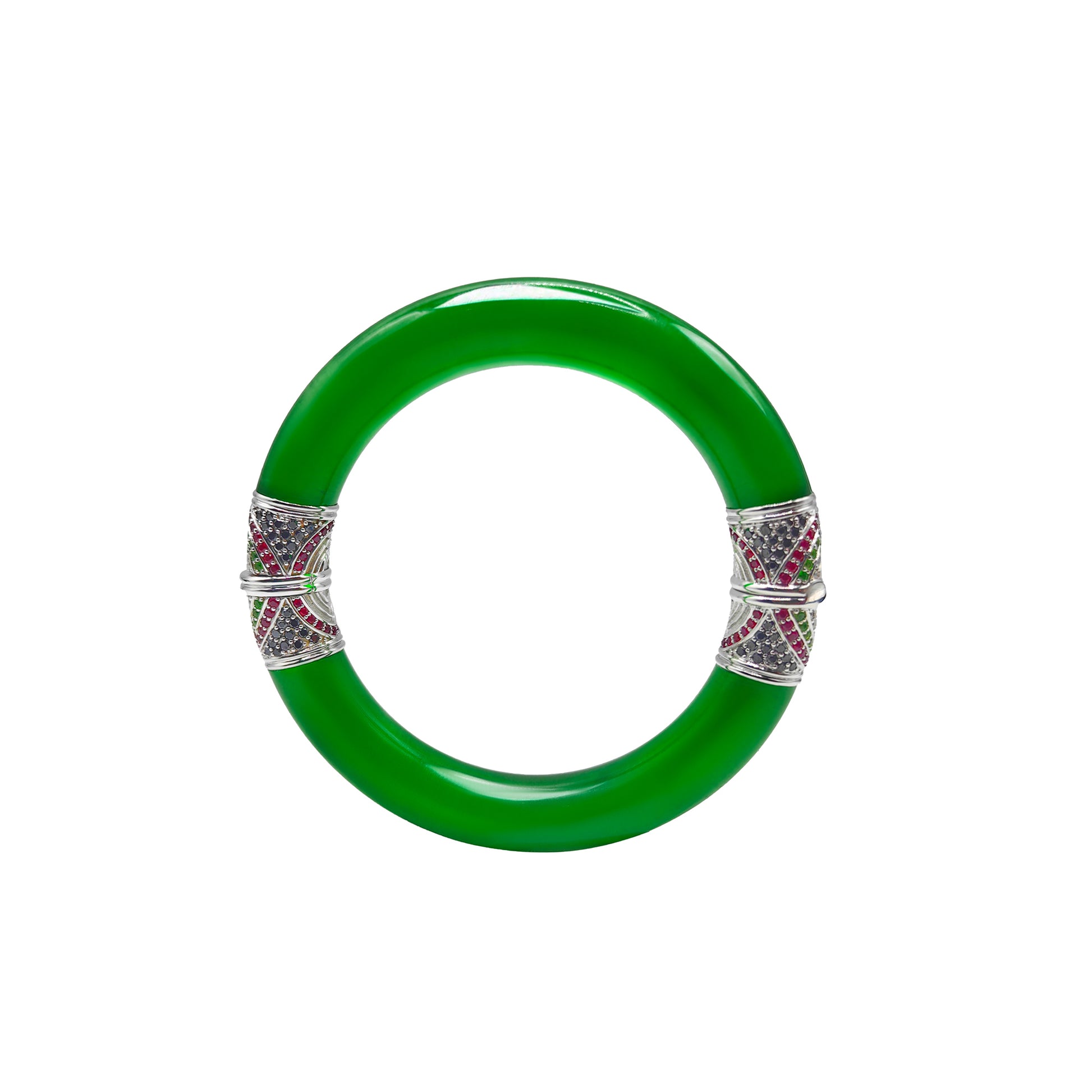 Round Jadeite Hinged Bangle with Pavé Rubies, Black Diamonds & Green Spinels in 18k Gold