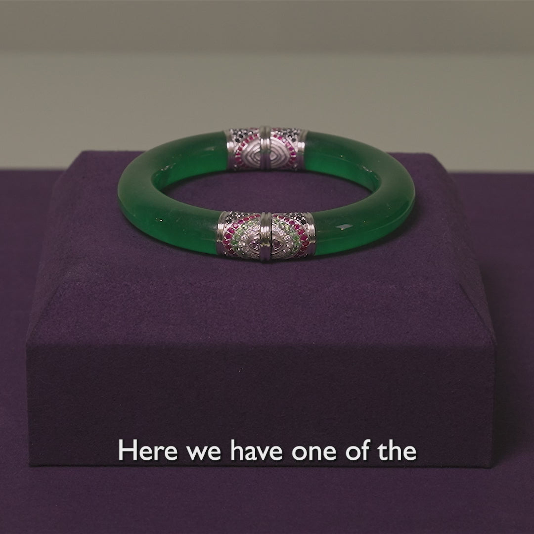 An exquisite fusion of elegance and bold design, this round jadeite hinged bangle is set in 18ct white gold. Its rich green hue is beautifully enhanced by a mesmerising pavé of vibrant rubies, mysterious black diamonds, and luminous green spinels, creating a striking interplay of colour and brilliance.